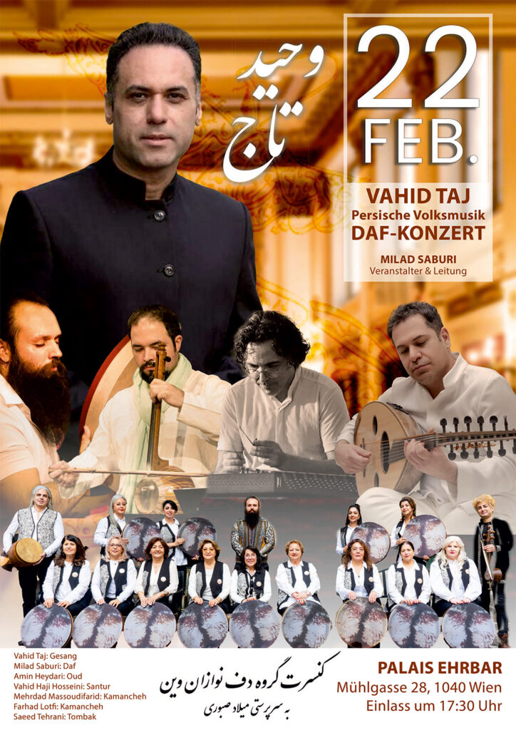 Zum dritten Mal erklingen die kraftvollen Rhythmen der Vienna Daf Ensemble unter der Leitung von Milad Sabouri im practvollen Ehrbar Saal. Mit dem Ehrengast Meister Vahid Taj sowie Begleitung herausragender Musiker an Kamancheh, Oud, Santur und Daf lädt dieses Konzert zu einer musikalischen Reise in die Tiefe von Gefühl, Rhythmus und der Authentizität der persischen Musik ein.